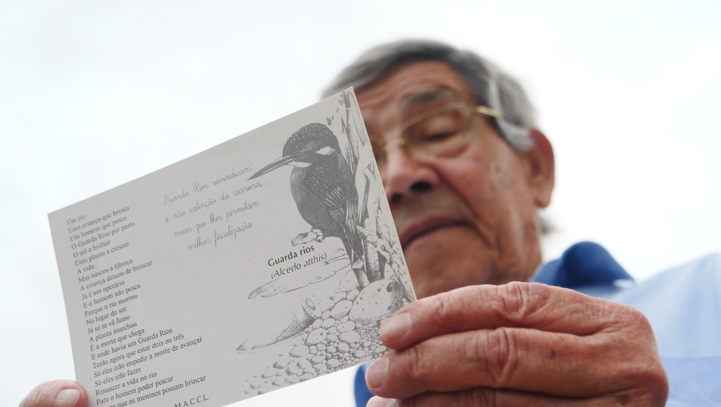 O poema está assinado com as iniciais “M.A.C.C.L.”. Luís Alves não se recorda de quem o escreveu. Foi impresso na margem esquerda do postal, acompanhado, à direita, de uma ilustração de um guarda-rios, a pequena ave que se encontra amiúde nas linha de água da Europa e norte de África, do seu nome científico e do apelo: “Guarda Rios reivindicam: a não extinção da carreira, meios que lhes permitam melhor fiscalização”. Foi enviado pela Federação Nacional dos Sindicatos da Função Pública ao presidente da República, então Mário Soares, explica o antigo guarda-rios durante o nosso encontro, na terra devidamente apelidada de Rossio ao Sul do Tejo.