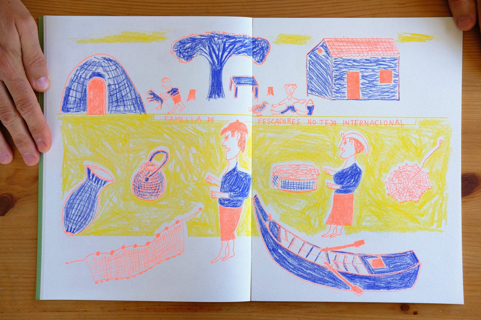 O Coletivo Guarda Rios pretende responder à desertificação do território e à escassez de água através de uma prática de investigação e criação que propõe “uma cultura da água e uma aproximação aos rios, através de criações artísticas participativas e processos de co-aprendizagem, convivialidade e celebração”. Em seis anos de existência e somadas nove residências e 12 eventos e exposições pelo país, Francisco Pinheiro e Nuno Barroso, artistas visuais e co-fundadores do coletivo, reuniram material histórico, documental e artístico para criar um “laboratório do futuro” em constante evolução que promove o pensamento crítico sobre o impacto humano nos recursos hídricos e oferece caminhos para a reconexão. Da segunda residência do coletivo no rio Tejo, passada na Tapada da Tojeira, Vila Velha de Ródão, em maio de 2020, resultou uma publicação a partir das ilustrações de Alexandre Fonseca Augusto Jesus, guarda rios, cujo espólio se encontra na Junta de Freguesia de Perais.