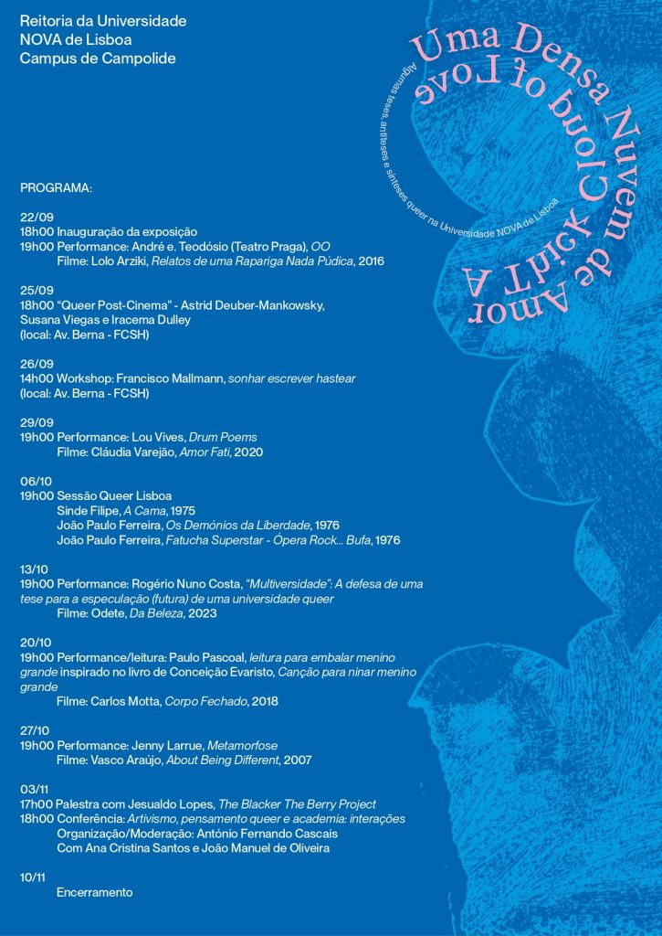 A Reitoria da Universidade NOVA de Lisboa, no Campus de Campolide, acolhe entre 22 de setembro e 10 de novembro o projeto “Uma Densa Nuvem de Amor / A Thick Cloud of Love. Algumas teses, antíteses e sínteses queer na Universidade NOVA de Lisboa”. Com entrada gratuita, esta iniciativa do Programa NOVA Cultura, em parceria com o Gabinete de Igualdade e Inclusão, propõe uma programação intensa e diversificada que cruza artes visuais, performance, cinema, pensamento crítico e ativismo queer.