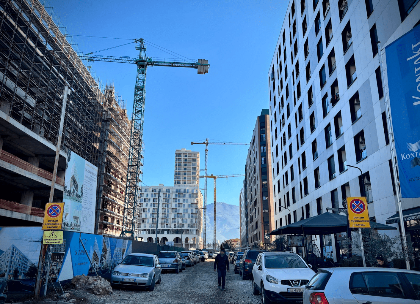 No mesmo espaço coexistem pequenas moradias onde provavelmente viveram dirigentes do Partido Socialista durante o regime (1944-1990): edifícios construídos após o seu fim, juntamente com construções imponentes como o Blloku Cube de Stefano Boeri, a sede do Credins Bank projetada pelo estúdio albanês Atelier 4 e outros dois arranha-céus em construção projetados pelo estúdio de Marco Casamonti. Da varanda de um antigo edifício, destaca-se uma faixa que critica as políticas de construção do governo. Um pouco mais adiante, Vukaj aponta para um edifício que será demolido para dar lugar a outra torre. Em volta, nenhum sinal de parques ou ciclovias.