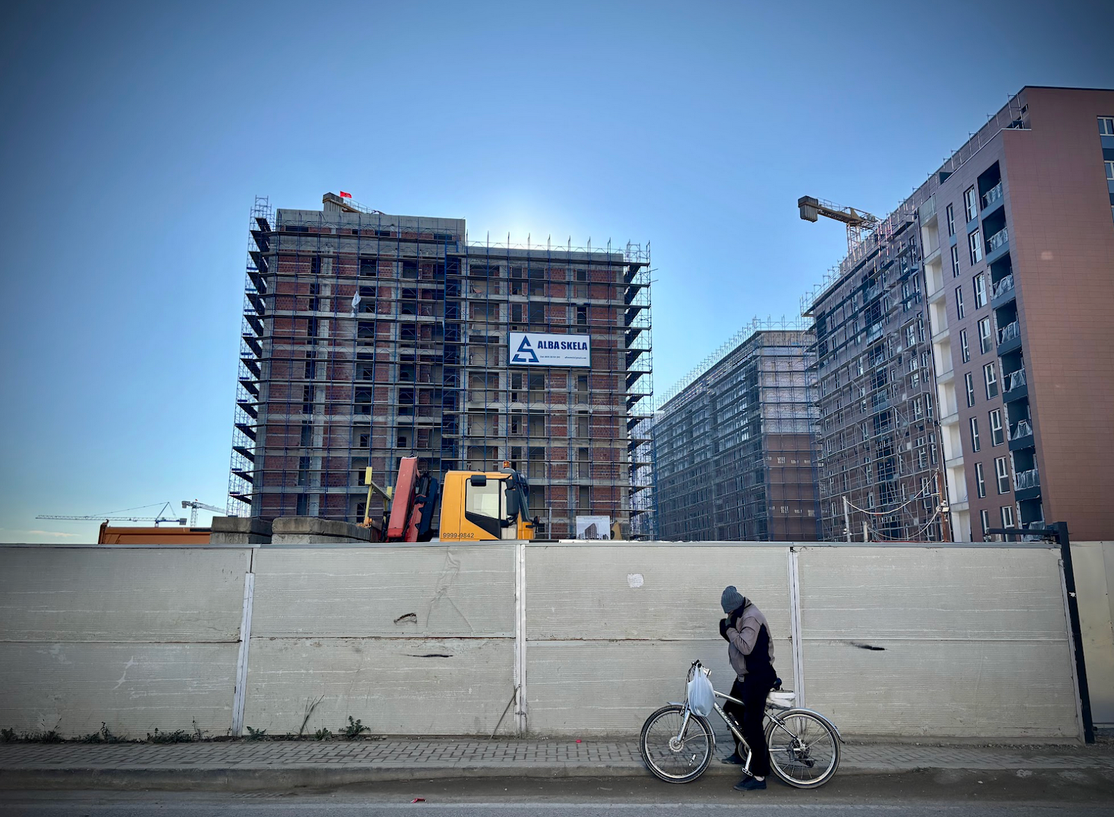 No mesmo espaço coexistem pequenas moradias onde provavelmente viveram dirigentes do Partido Socialista durante o regime (1944-1990): edifícios construídos após o seu fim, juntamente com construções imponentes como o Blloku Cube de Stefano Boeri, a sede do Credins Bank projetada pelo estúdio albanês Atelier 4 e outros dois arranha-céus em construção projetados pelo estúdio de Marco Casamonti. Da varanda de um antigo edifício, destaca-se uma faixa que critica as políticas de construção do governo. Um pouco mais adiante, Vukaj aponta para um edifício que será demolido para dar lugar a outra torre. Em volta, nenhum sinal de parques ou ciclovias.